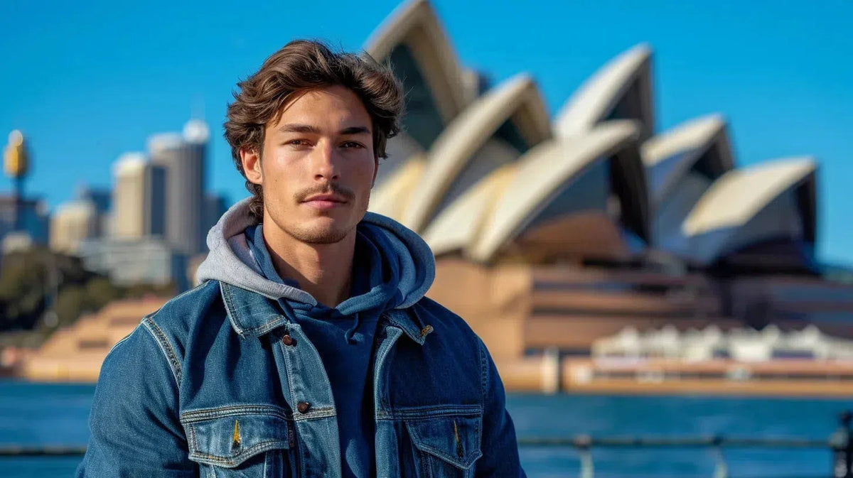 Diverse male model in casual jeans near Sydney Opera House. Late Winter  season.