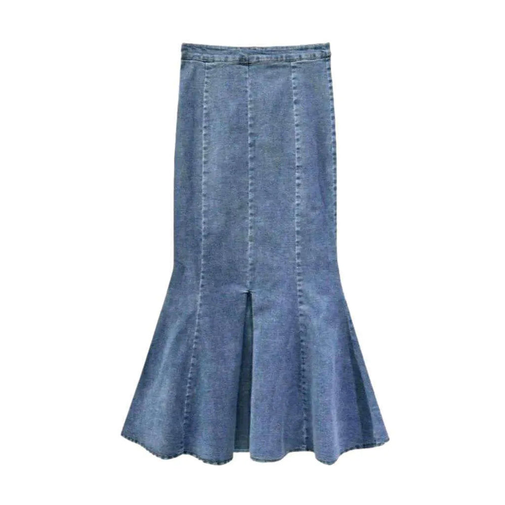 Be ready to make a statement this summer in our light blue, long fashion skirt from our 2023 Summer Collection! Crafted from high-quality, stretchy fabric with a bleached finish, this trumpet-trend skirt features a high-waist design for a timelessly chic look.